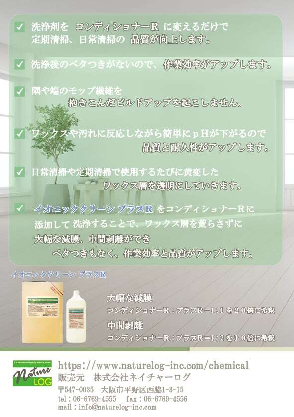 またやわらかいパットでワックス処理された床を洗浄した場合本洗浄剤の研磨効果とコンディショニング効果が発揮され光沢が復元する場合があります。洗浄後バフィングを行えば一段と光沢が復元します。