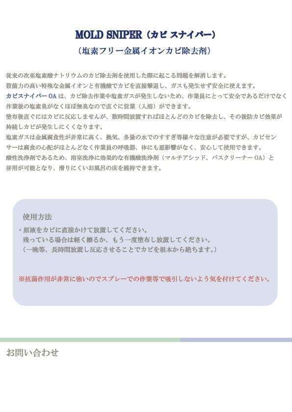 カビスナイパーOAはカビ除去作業中塩素ガスが発生しないため、作業員にとって安全であるだけでなく、作業後の塩素臭がなくほぼ無臭なので直ぐに営業(入浴)ができます。