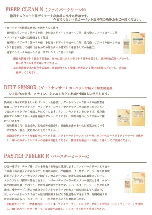 ファイバークリーンR は従来のカーペットクリーナーと違い、汚れを分解後特殊還元効果の特徴を活かし乾燥するまでの間、繊維に染まった汚れ染みを抜いていく特徴を持っています。マイクロファイバー等での拭き取り洗浄でも優れた洗浄力を発揮します。またエクストラクターでのリンス後のカーペット繊維の毛細管現象により起こるウィックバック汚染を抑制する効果が期待できます。 ファイバークリーンR はマイナスイオンの特性を生かし素材と汚れを完全に分離させ洗浄中の再付着汚染を起こしません。洗浄後マイナスイオンのコーティング効果で汚れにくい素材を作り出します。ただしアルカリ性で刺激が中性よりも強いので、ウールや緞通絨毯等デリケートな素材には ファイバークリーンN をお使いください。生分解性が非常に高く人体(使用者、住居者)や環境に限りなくやさしいクリーナーです。